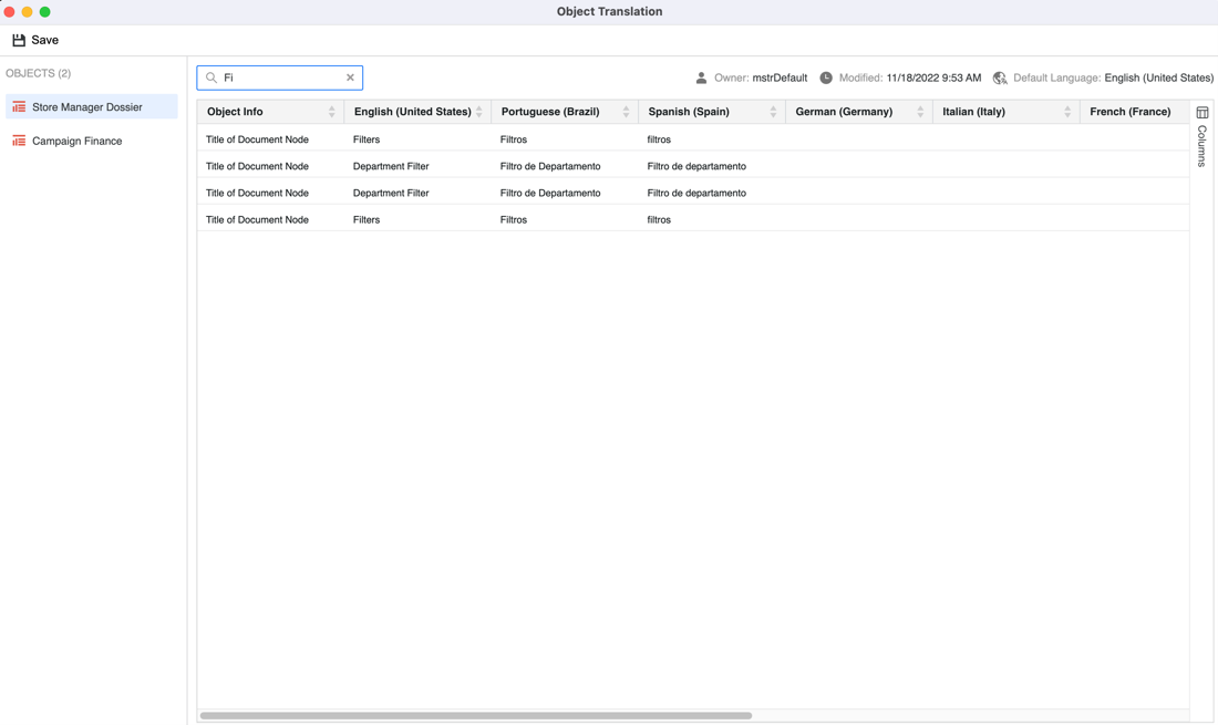 - In the Object Translation window, select the object that you want to translate. Once you select an object, translations for all supported languages appear.