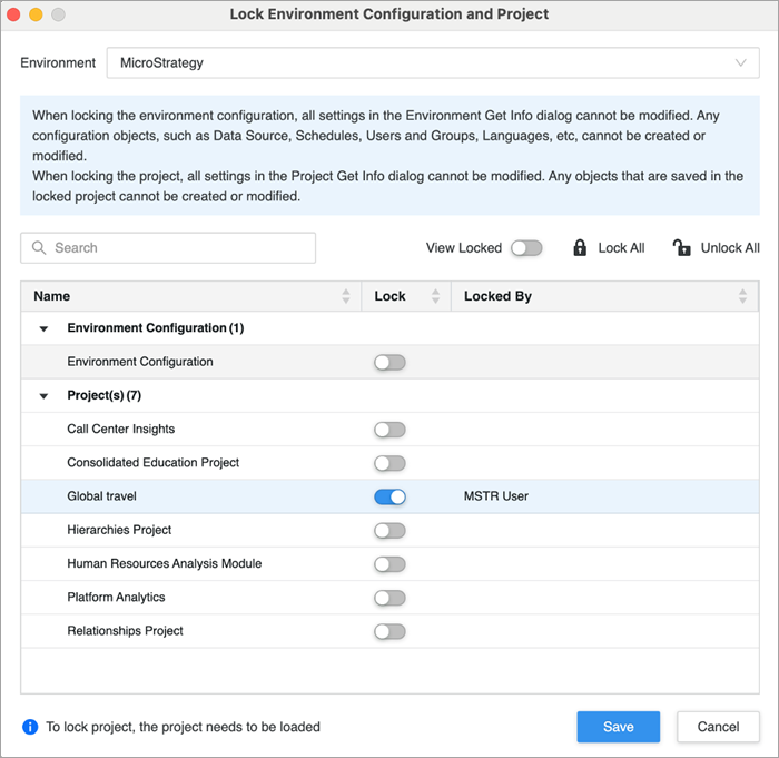 Starting in the MicroStrategy 2021 Update 6 July monthly release, you can lock and unlock configurations and projects in Strategy Workstation.