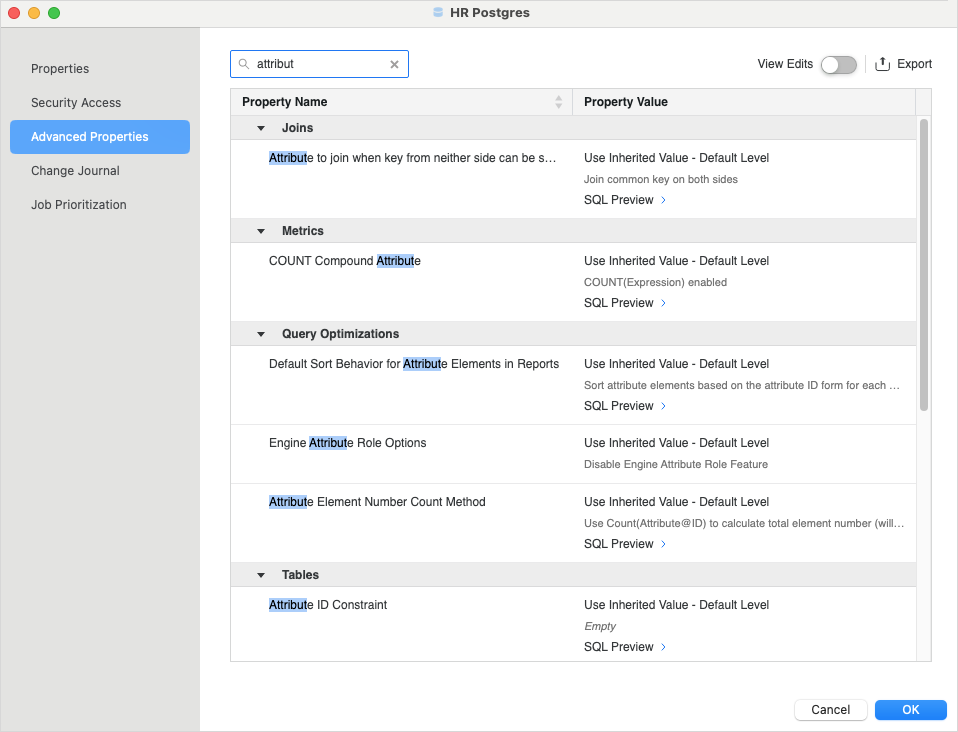 Intelligent cubes, incremental refresh reports, projects, and data sources all have advanced properties that provide control over analytical calculations and query generation.