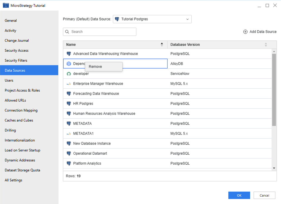 To remove a data source, right-click it and choose Remove.