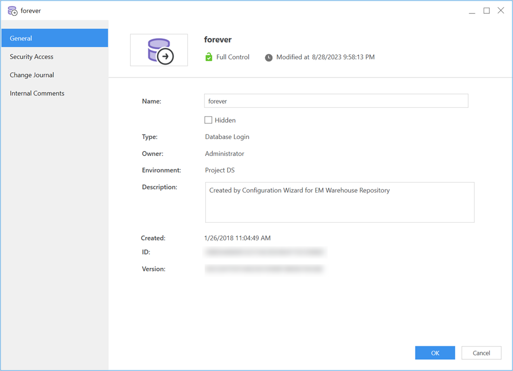 To view general properties, the change journal, or security access for modifying ACLs, right-click a database login and choose Properties.