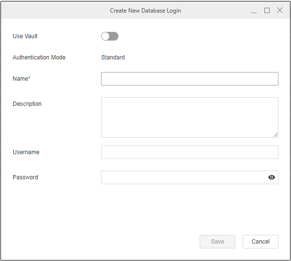 If you are using a standard database login, disable the Use Vault toggle, complete the remaining fields, and click Save.