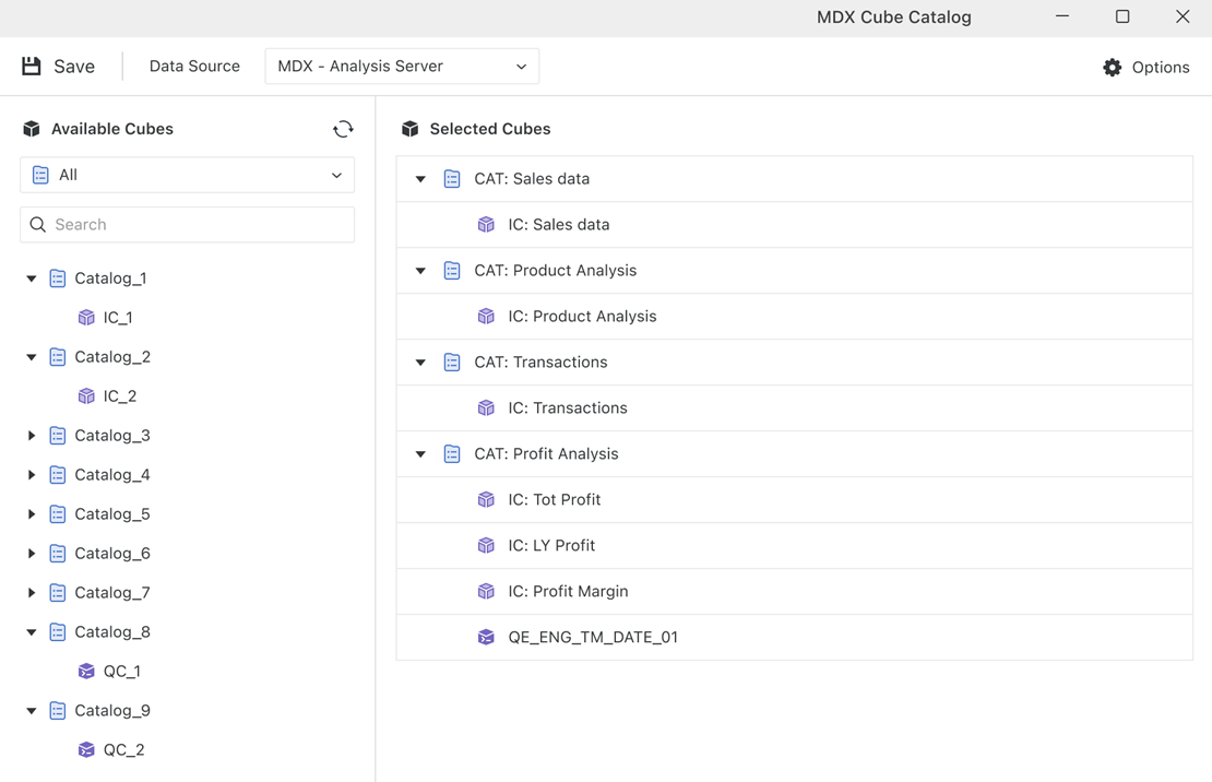 Strategy Workstation provides a modern and simplified interface for managing MDX cube catalogs. Through the MDX Cube Catalog Editor, you can connect to external MDX data sources, browse available cubes, and add them to your project.