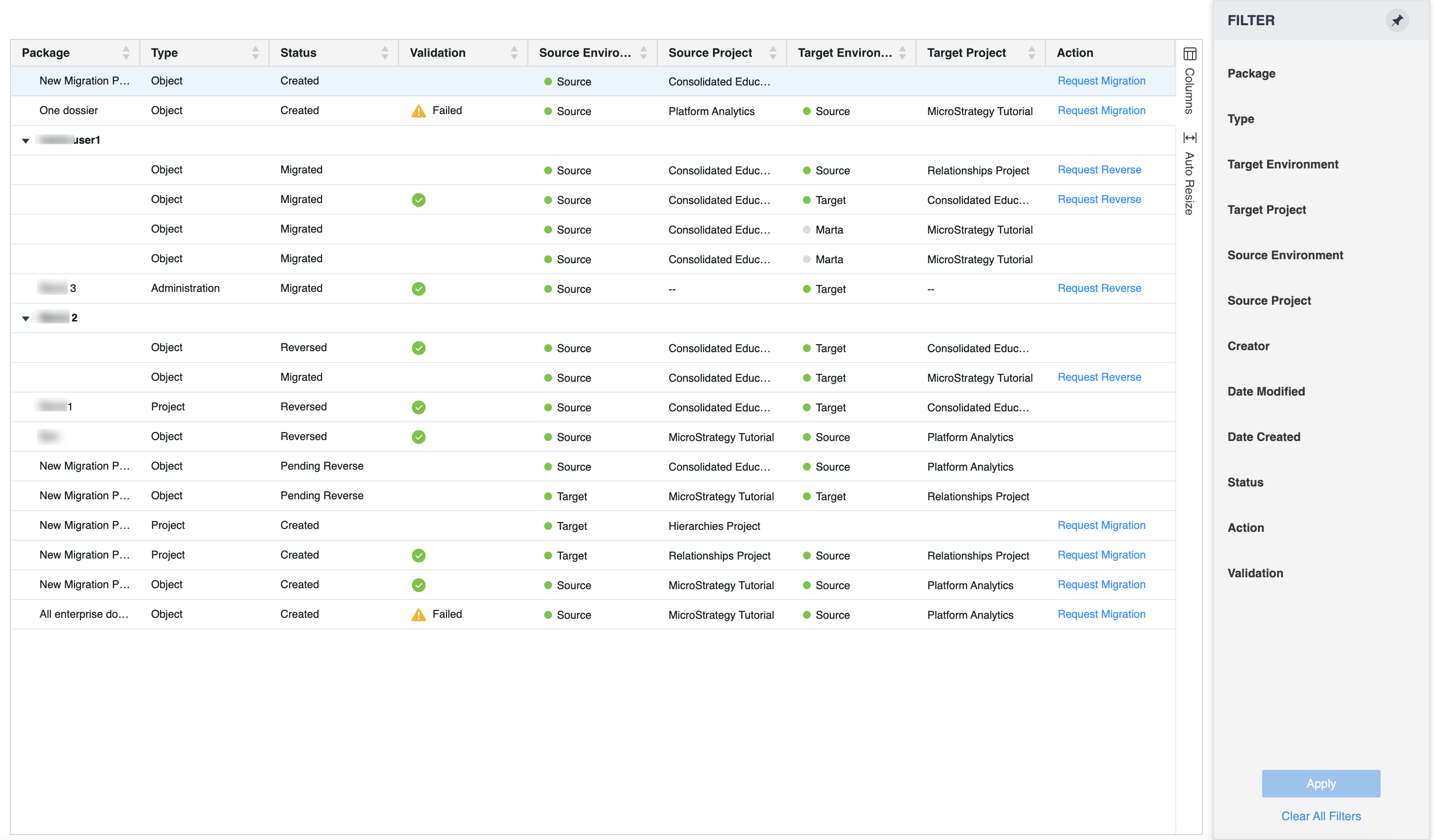 Only an Administrators should be able to migrate packages into the target environment and/or projects. Other users should be able to request migrations. See Assign Privileges to Use Migrations for more information.
