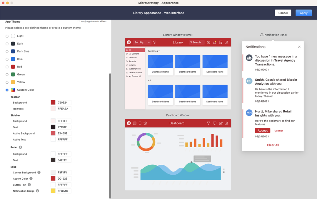- Starting in MicroStrategy ONE Update 12, once you select a theme, you can select Apply app theme to all agents to apply the theme to all agents and overwrite the themes selected by agent authors.