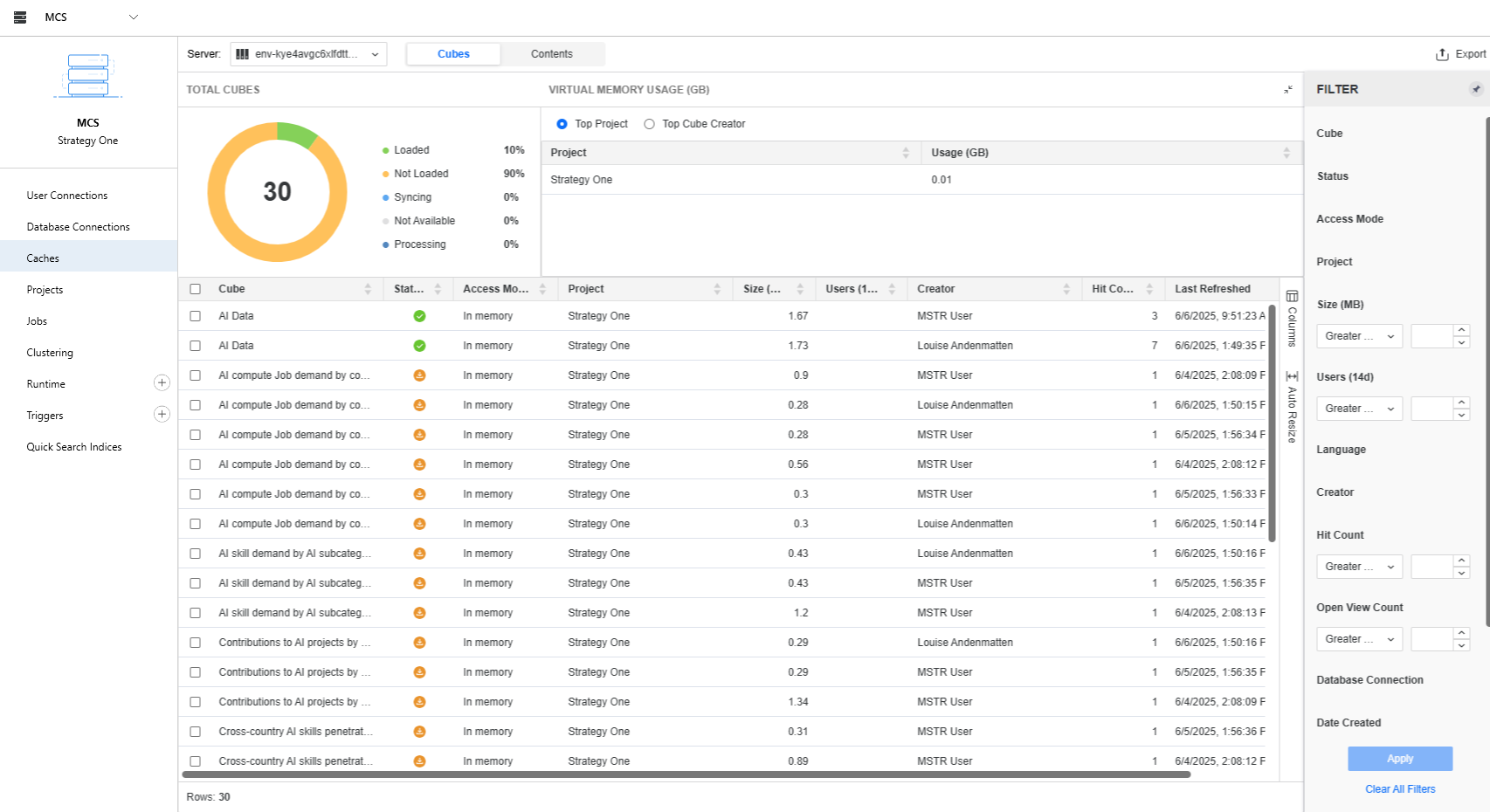 By default, not all cube caches are loaded in memory. Starting in Strategy One (June 2025), you can view the various statuses of the cube caches, which are the following: