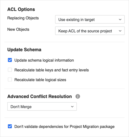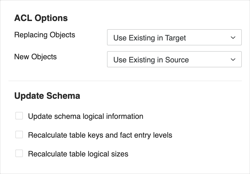 to set ACL Options and Update Schema for migration objects.Click here for more details about the options.The ACL Options control what permissions are applied to objects when a conflict is resolved with a Replace, Create New, or Keep Both action.