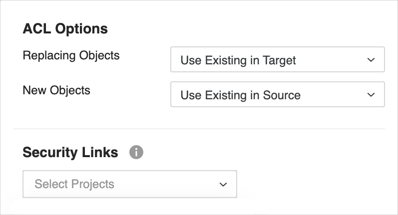 to set ACL Options and Security Links for migration objects.Click here for more details about the options.The ACL Options control what permissions are applied to objects when a conflict is resolved with a Replace, Create New, or Keep Both action.