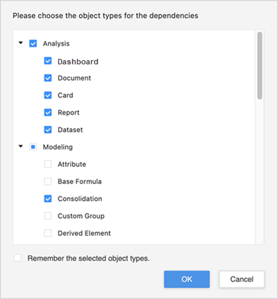 Your selections on this dialog are remembered the next time you add dependencies. If you don't want to add different object types as dependencies, select Remember the selected object type and the dialog will not appear again for this package.