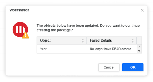 When objects are updated before the user clicks Create, an error with the object name and failure details appears. This message details whether the object was deleted, modified, or there is no longer read access since the objects' ACL changed.