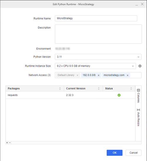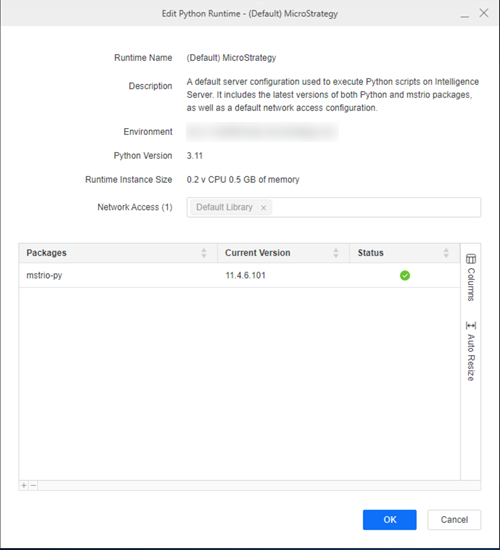 The default runtime includes the latest versions of both Python and mstrio packages, as well as a default instance size and a default network access configuration. You can use mstrio package to access MicroStrategy data using the default runtime.