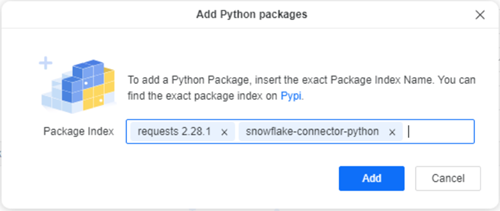 Package: The Python packages to be installed in the Python runtime. The latest version will be installed if the package version is not provided.