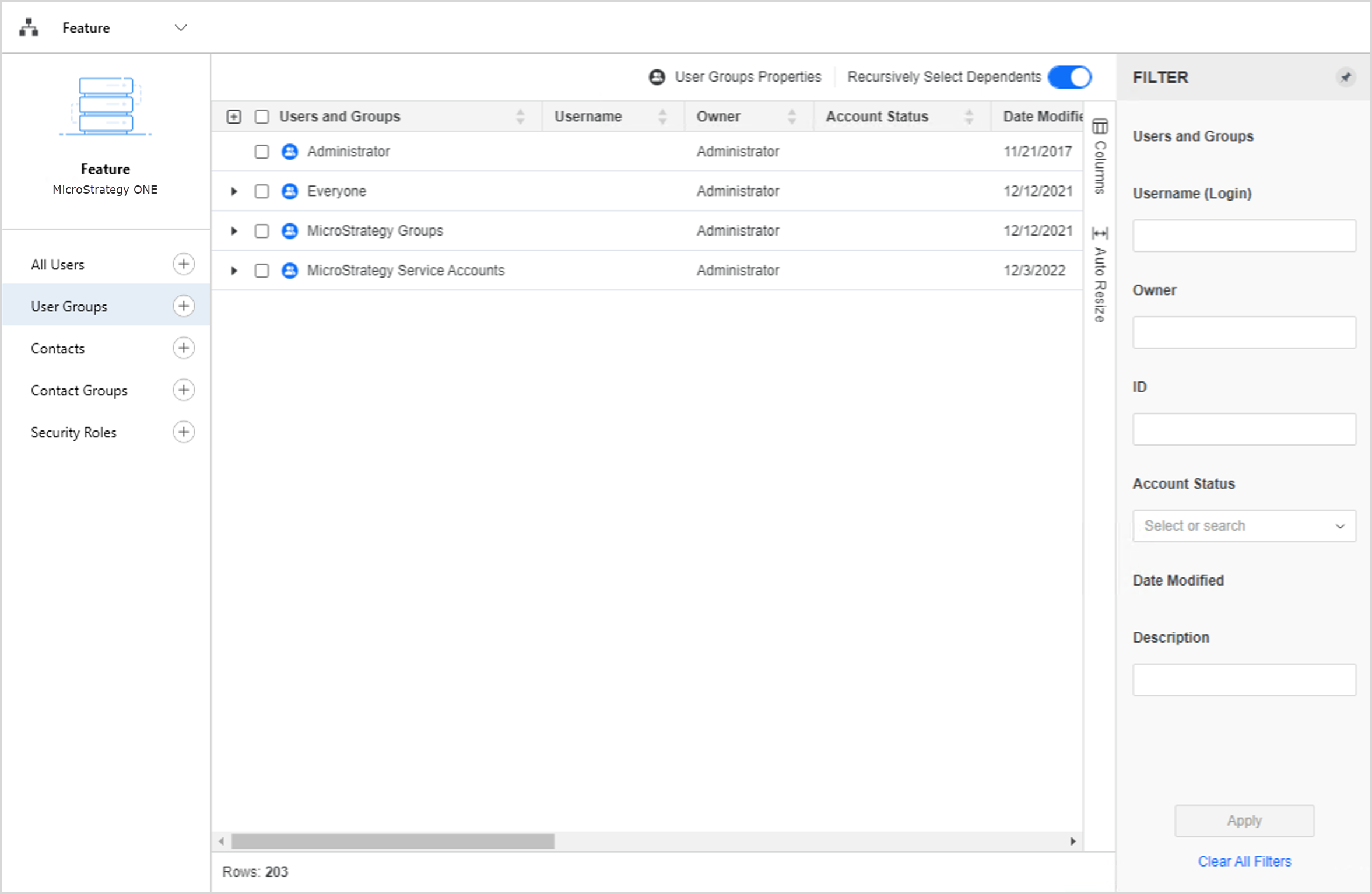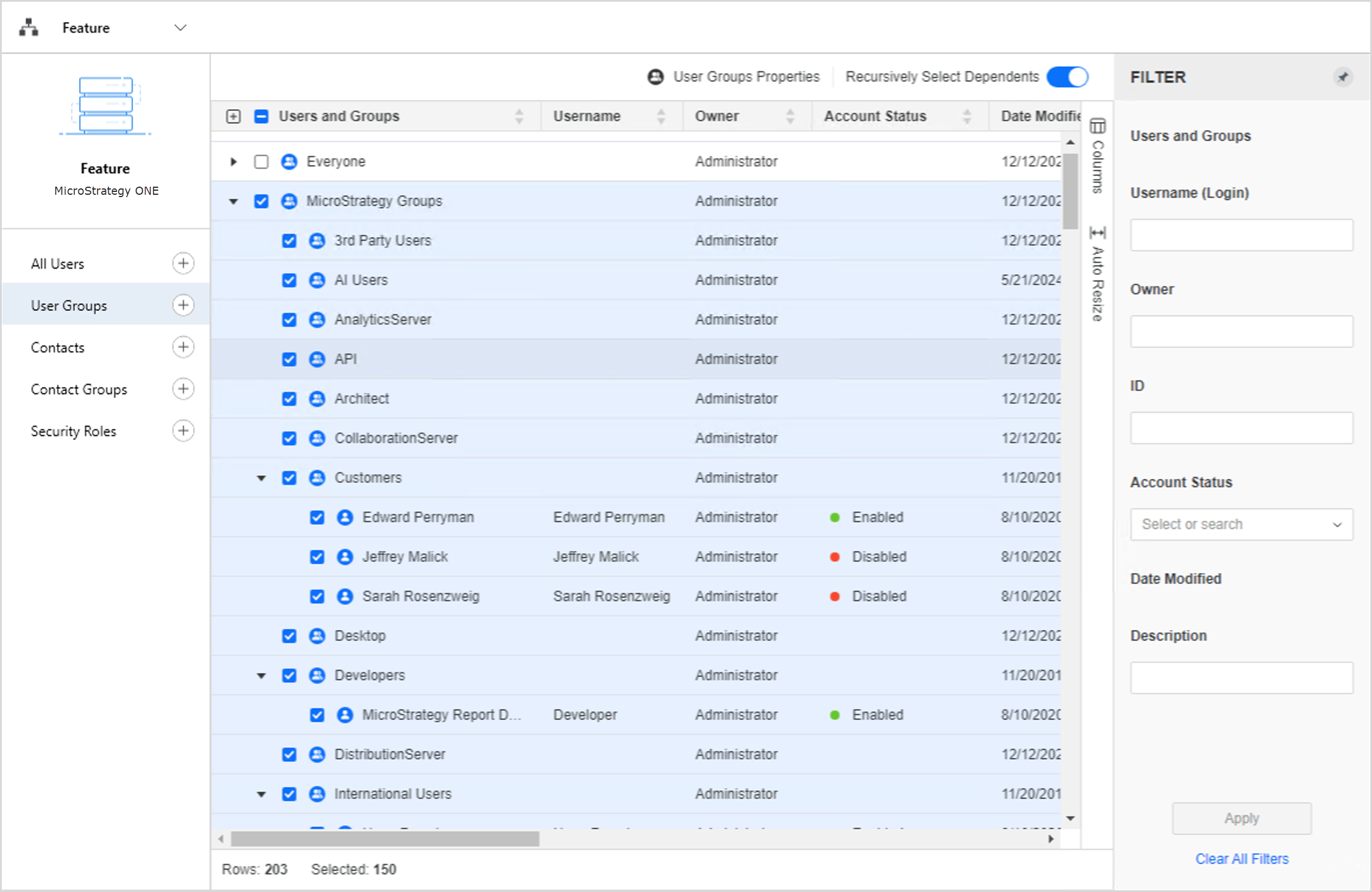 Starting in MicroStrategy ONE (June 2024), Administrators can automatically select all dependents of a parent user group, simplifying the selection of all nested users and user groups. This enhances the efficiency of bulk actions in the User Group monitor.