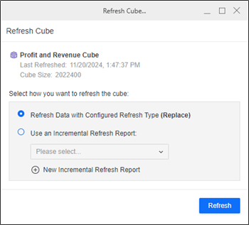 Use an Incremental Refresh Report: Choose this option to use a report to refresh your data. Choose a refresh report from the drop-down list or click New Incremental Refresh Report to create a new report.