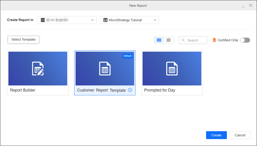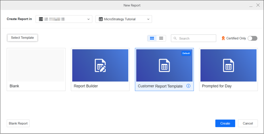When a project has a default template, you can disable the Blank report template. It no longer displays in the list or as the Blank Report button in the lower left, as shown below.