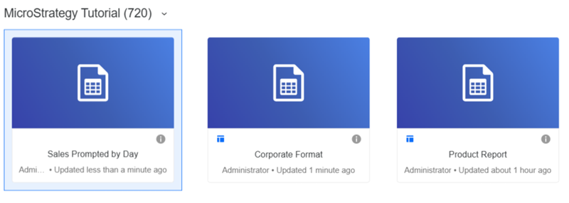 Once a template is created or an existing report is set as a template, it displays with a template icon . In the image below, Corporate Format and Product Report are both templates, while Sales Prompted by Day is not.