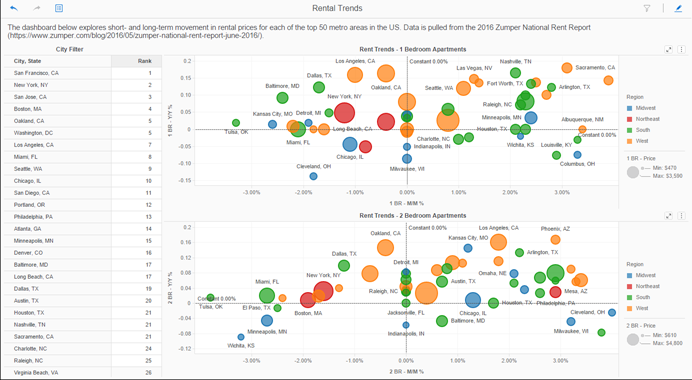 If you created a visualization that filters another visualization, you can use it as a filter. In the example, below, you can select a city in the City Filter visualization, which updates the Rent Trends bubble graphs to display data for only the selected city.