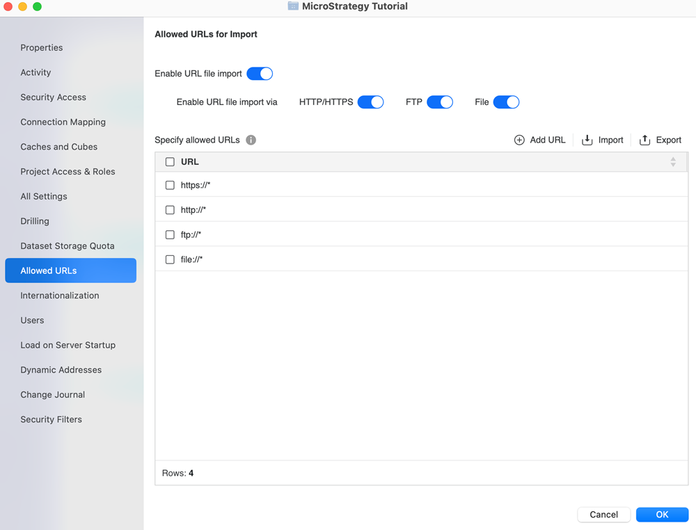 If the Data from URL option is not available, contact your administrator to confirm importing reports from a URL link is enabled. For security reasons, URLs may be restricted to a set defined by your administrator. After attempting to import a URL, if you receive a message stating that the import URL does not meet the criteria set in the Allowed URLs list, contact your administrator. If you have administrative privileges, define the allowed URLs.