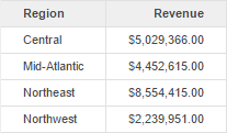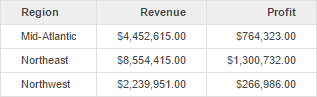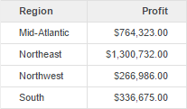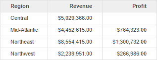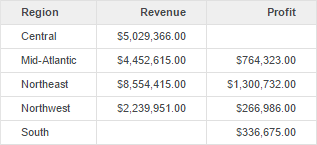 If you change the Regional Profit dataset to a secondary dataset, its values only appear if the primary dataset, Regional Revenue, contains a value. South does not appear on the grid because the primary dataset, Regional Revenue, does not contain data for the South region. Central appears, even though it does not have any Profit data, since it belongs to a primary dataset. All values appear for primary datasets, regardless of whether they appear in other datasets.