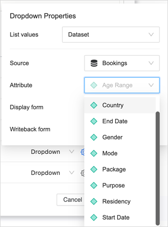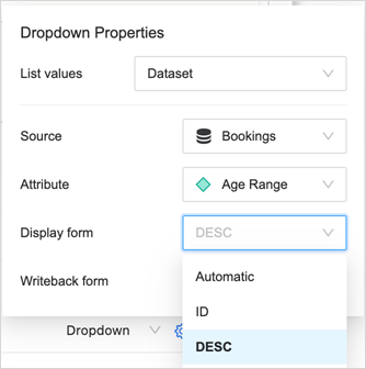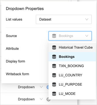 From the DDIC (data driven input control) dropdown list, you can choose any dataset in the dashboard, an attribute from that dataset, and pick display attribute forms and the attribute form to write back.