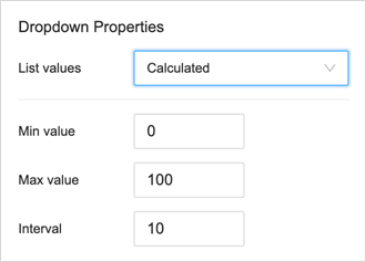 For the Dropdown list control type, calculated list, manual input list, and a data driven input control list is supported. For the Calculated list, you can set the value range and interval size.