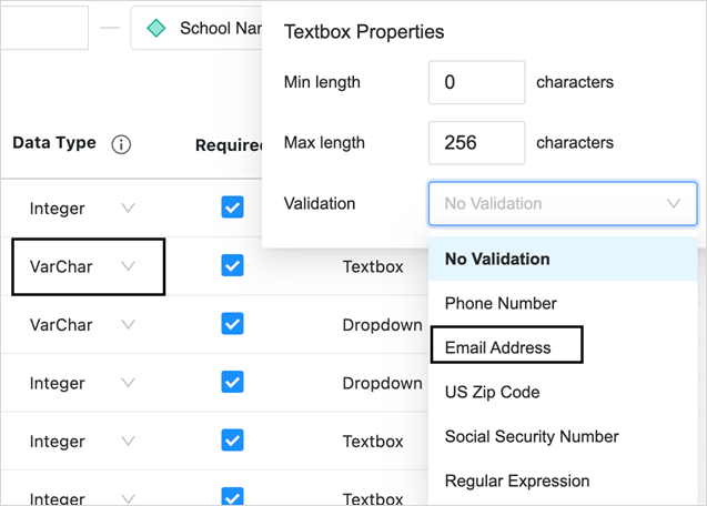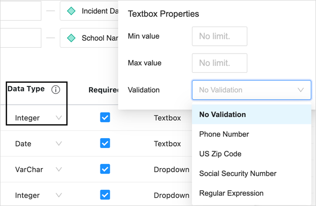 For the Textbox control type, depending on the data type, number and string based configurations are provided with corresponding validations.