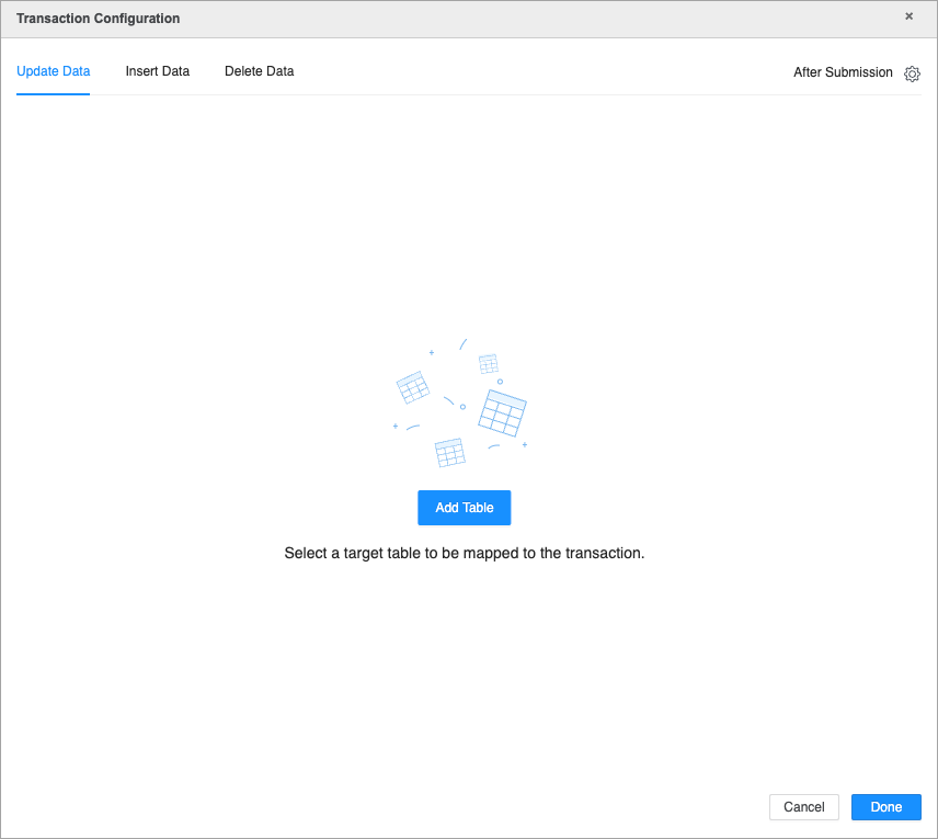 Choose to update, insert, or delete data and click Add Table.