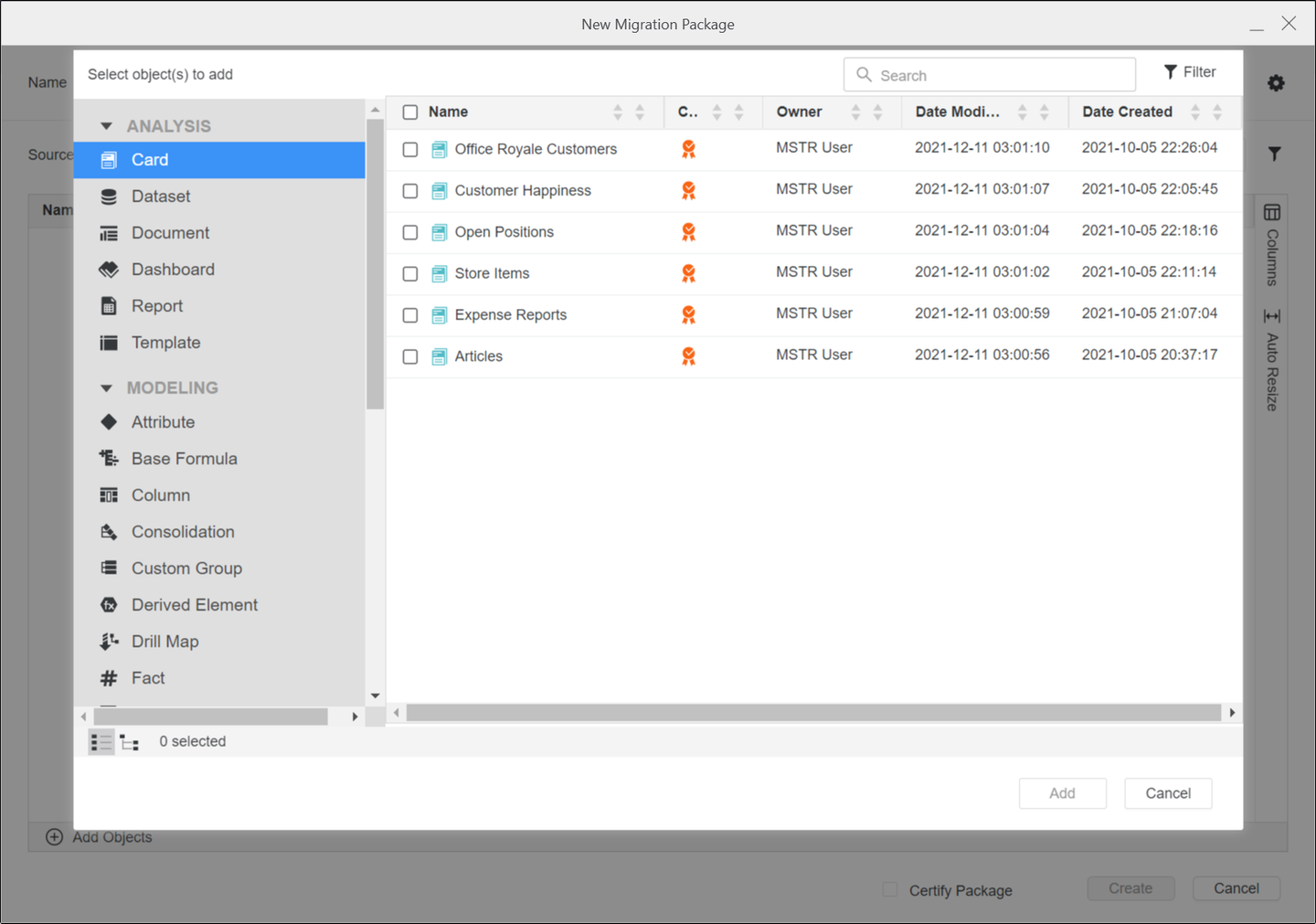 Below is a comprehensive list of supported objects for each of the three types of migration packages: