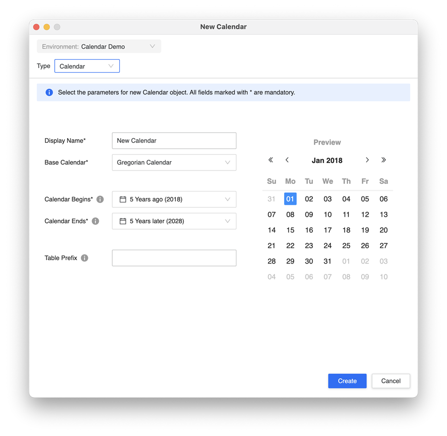 In Table Prefix, optionally control where in your database the Calendar tables are created. You can assign a dedicated namespace to keep Calendar tables separate from your data.