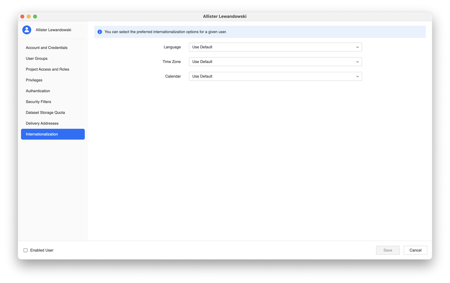 Select the default internationalization objects for the user.