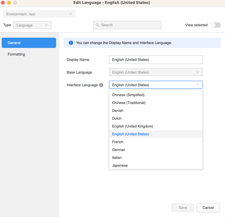Starting in MicroStrategy 2021 Update 10, users can choose an interface language for language objects.
