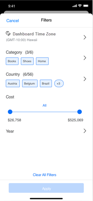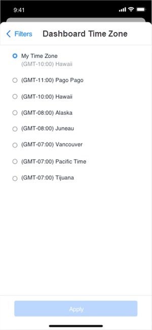 Library Mobile: Time zone based reporting is currently only available on iOS. Library Mobile offers the consumption experience only. Users can switch time zones through Filter panel.