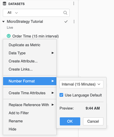 In a dashboard, open the Datasets panel. Starting in MicroStrategy 2021 Update 9, you can also set this formatting at the dashboard level using the Editor panel.