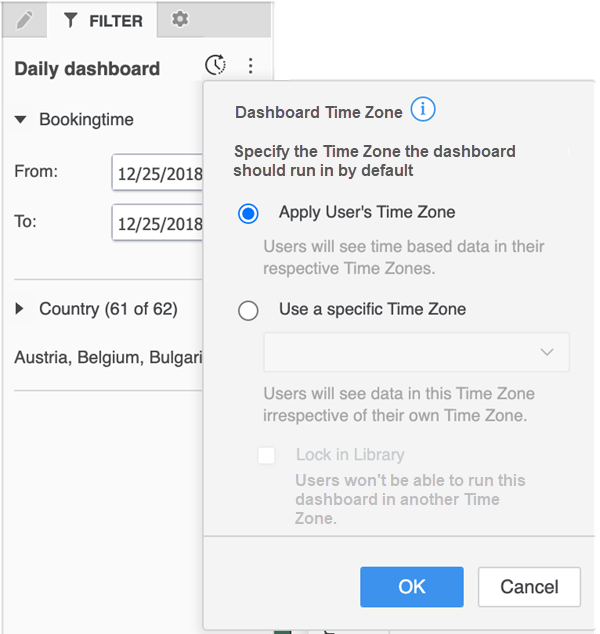 Select Apply User's Time Zone to open the dashboard in the time zone set for the user in their Library preferences. The time zone can also be assigned by the Administrator though the User Editor. If the user does not have a time zone specified, the dashboard opens in the project's default time zone.