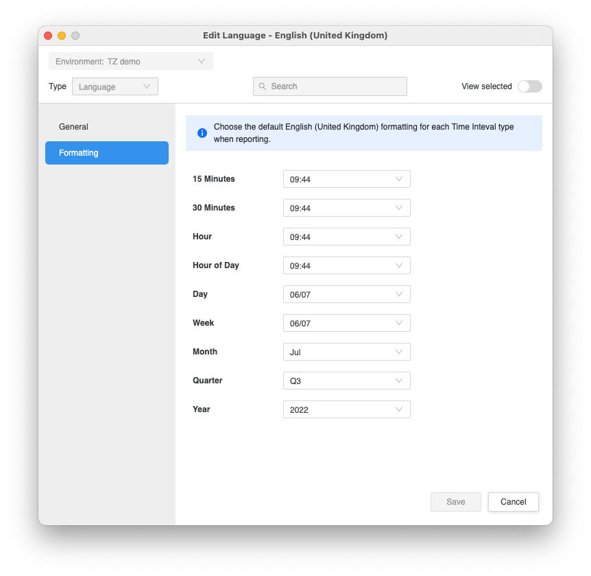 Starting in Strategy One (October 2025), you can translate language, calendar, and time zone names and descriptions.