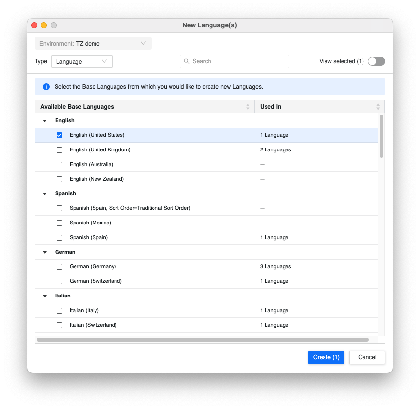 Select the base languages for your objects. Base languages have formats relevant to the given language and region to choose from.