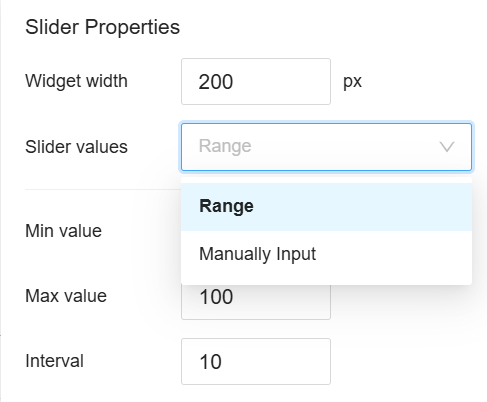 For the Slider control type, both range and manual input are supported.