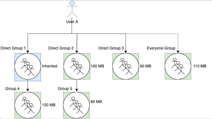 User A belongs to multiple groups who have the governing settings values set to an option other than Inherited. Since the groups have an assigned value, the Everyone group is ignored, and User A inherits the largest value from the closest parent groups, which is Direct Group 2.