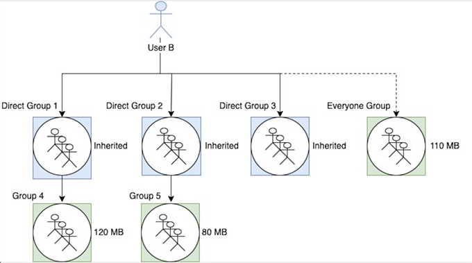 User B belongs to multiple groups, where all the direct parent groups are with the governing settings values set to Inherited. However, some indirect parent groups are with the settings set to an option other than Inherited. Since the parent groups have assigned values, the Everyone group is ignored, and User B inherits the largest value from the closest parent groups, which is Group 4.
