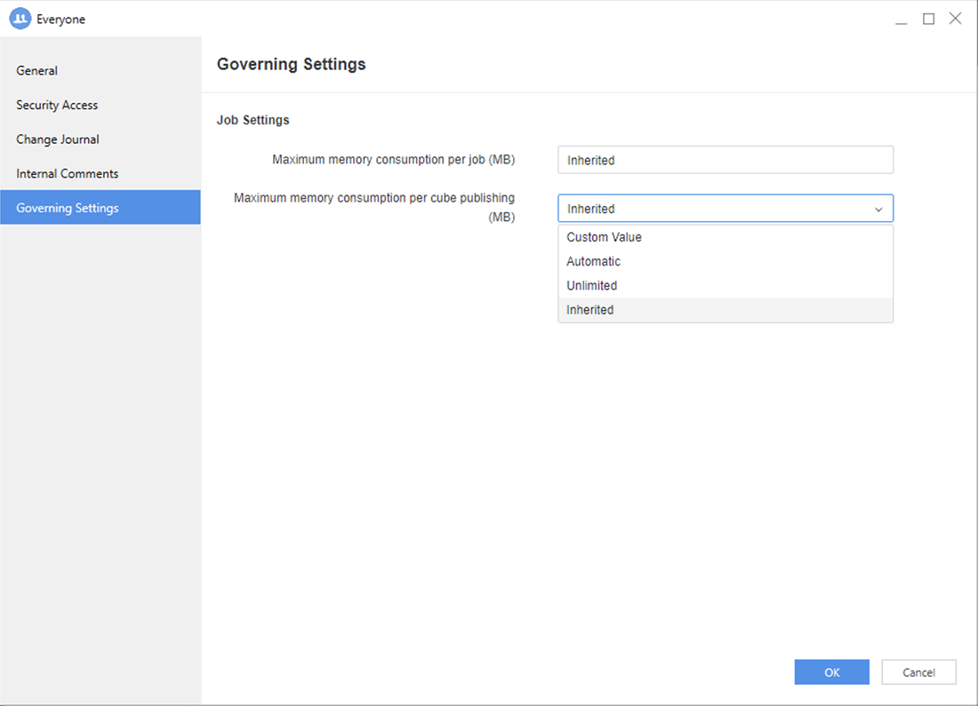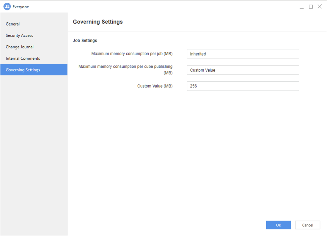 Users with the Administer jobs privilege can set a limit on the amount of memory consumed per job or cube in the Intelligence server for each user group to avoid outages and to combat low-memory situations. Administrators can set this limit through Governing Settings.
