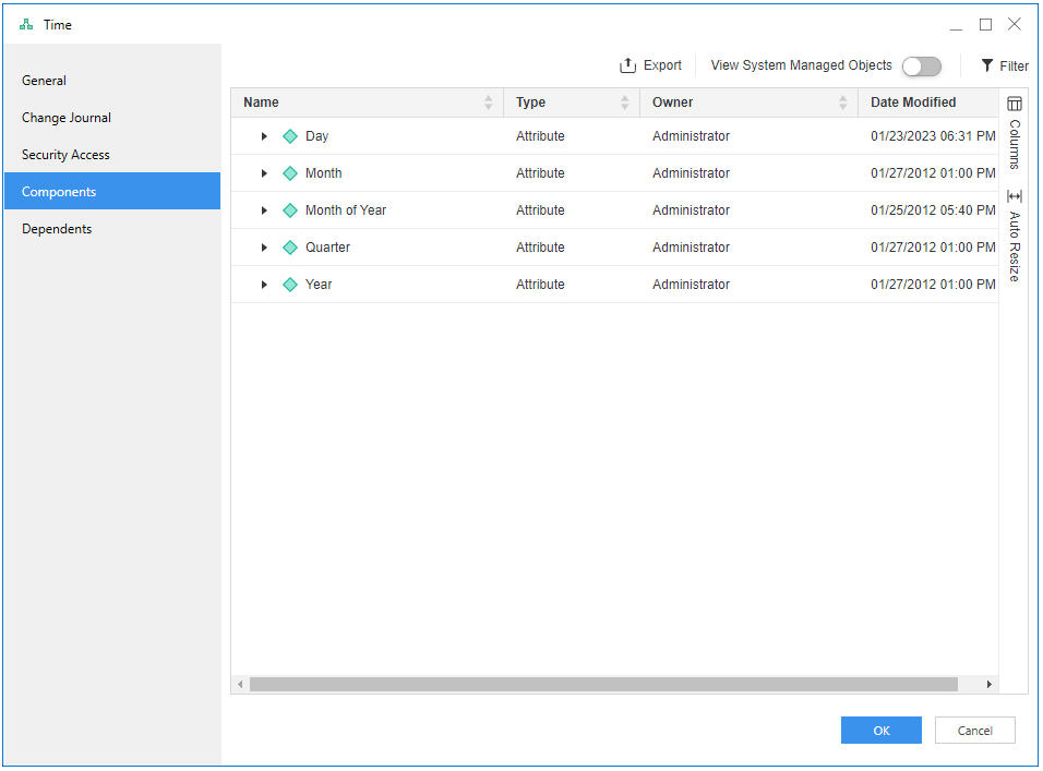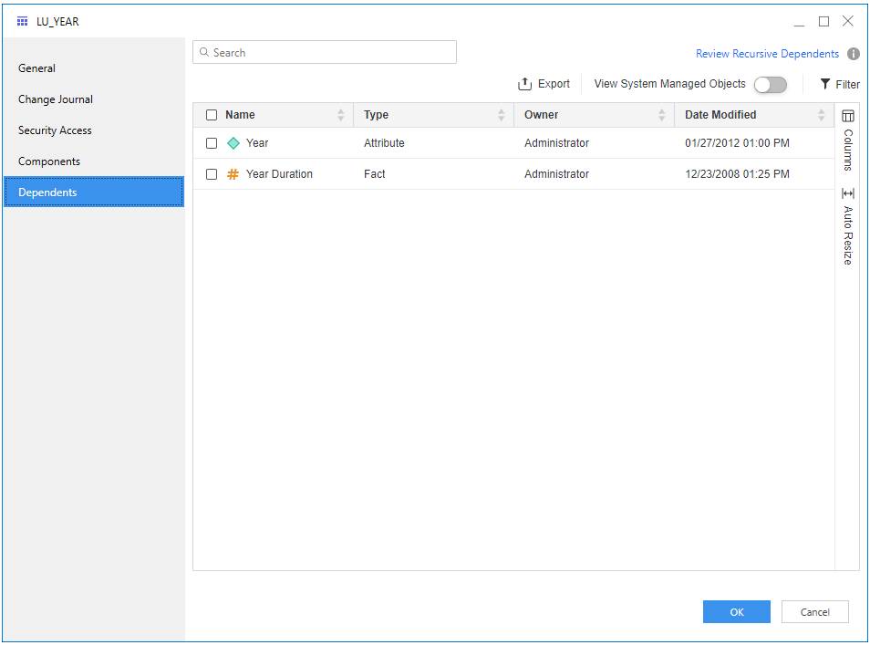 Starting in MicroStrategy ONE (March 2024), you can view components and dependents for hierarchies and tables. You can also view system managed objects, as well as an object's ID and location.
