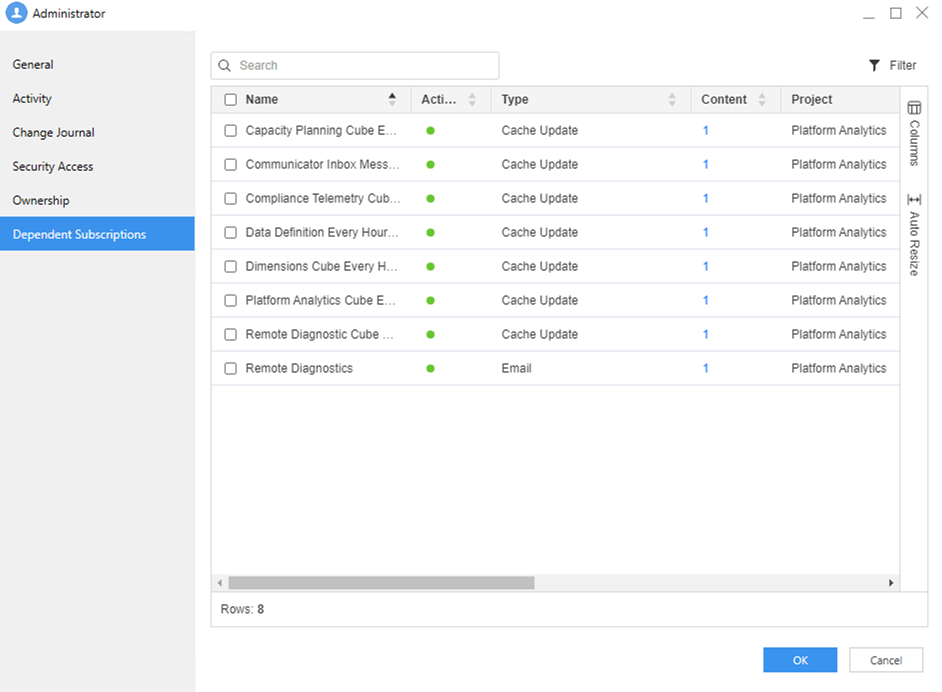 Starting in MicroStrategy ONE (June 2024), Administrators can easily access dependent subscriptions for a specific user. This streamlines the process of viewing subscriptions associated with a particular user, enhancing administrative efficiency.