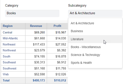 If the report is paged, drop-down lists display at the top of the report, as shown below. To change the subset of data displayed, select an option from the page-by drop-down list.