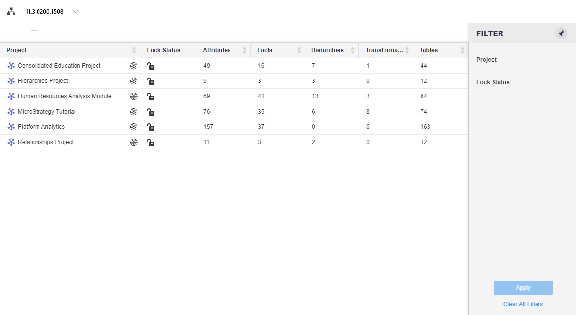 Filter Panel You can make selections to filter the grid by a specific Project or Lock Status. The filter summary appears at the top of the grid and you can remove elements or clear all filter selections from there.