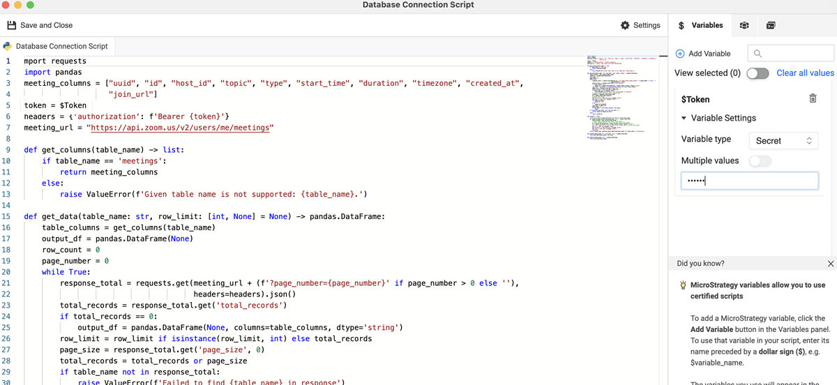 See the following zoom connector example. Users can connect to zoom resources with APIs in a python data source to retrieve any data they want. The example includes a variable named Token in the data source script for authentication.